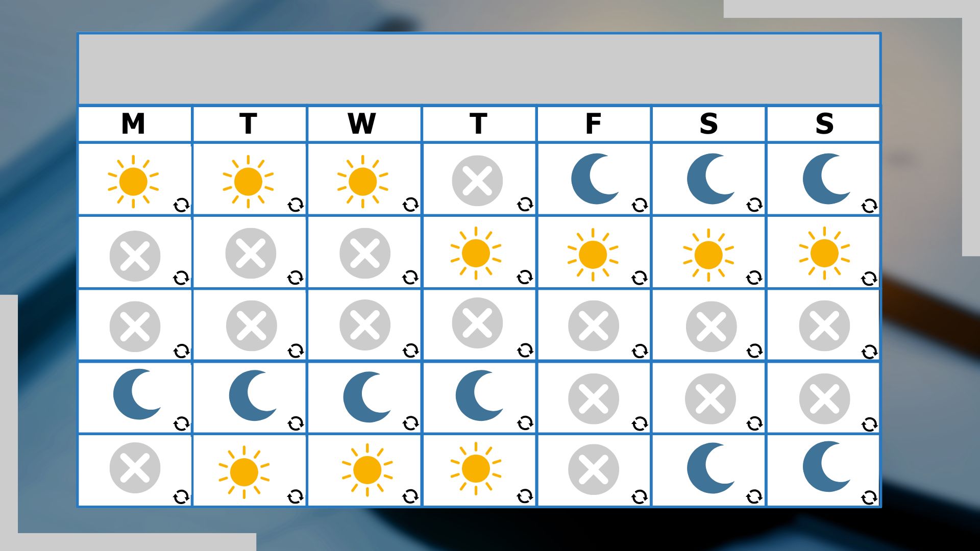 Om de verschuivingen te creëren, moet u eerst de logica van het rotatiecycluspatroon definiëren: frequentie (dagelijks, wekelijks, enz.), begindatum en einddatum. U kunt eenvoudig uw volledige planning maken, zelfs voor het hele jaar.